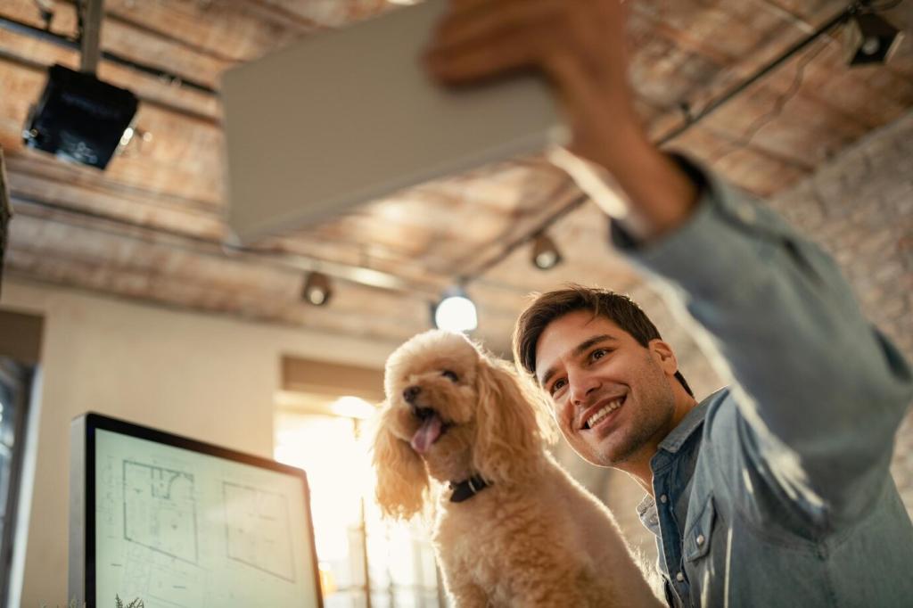 Waschbare Decken an Stammplätzen, transparente Kratzschutz-Paneele an Ecken und klare Regeln mit positiver Verstärkung verhindern viele Missgeschicke. Klickertraining lenkt Energie in gewünschtes Verhalten, statt zu schimpfen. Lege Matten an Sprungstellen und sichere Fensterplätze. Welche Präventionshelfer haben dein Zuhause entspannt? Teile deine Erfahrungen!